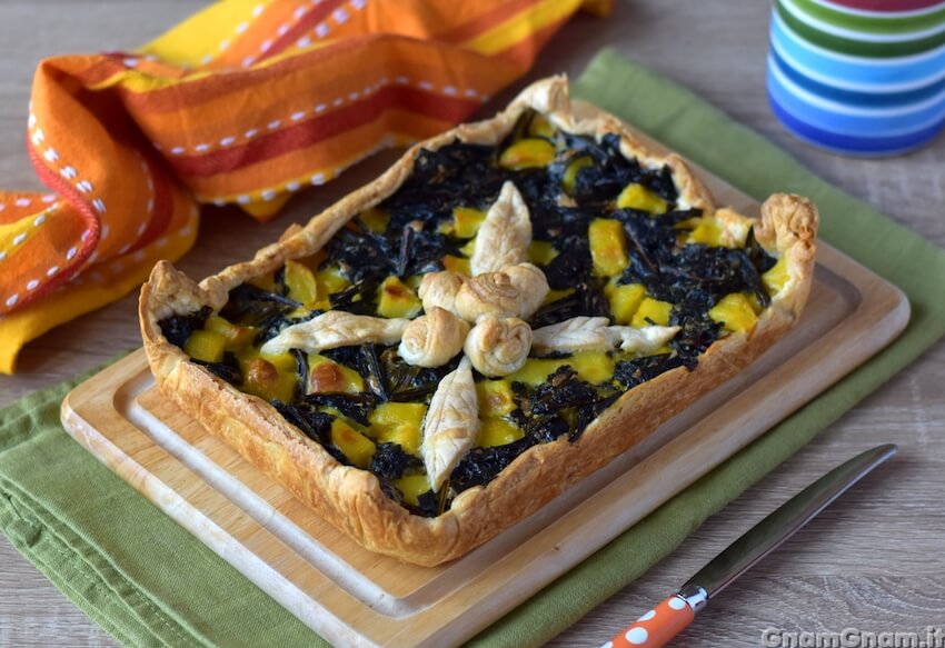 Per un tocco in più potete aggiungere all’impasto un po’ di brie o gorgonzola, che col cavolo nero ci stanno benissimo. Si può ovviamente untilizzare anche uno stampo circolare del diametro di 24cm, in questo caso non so perchè, ma mi piaceva l’idea di tagliare la torta salata in pezzi quadrati.